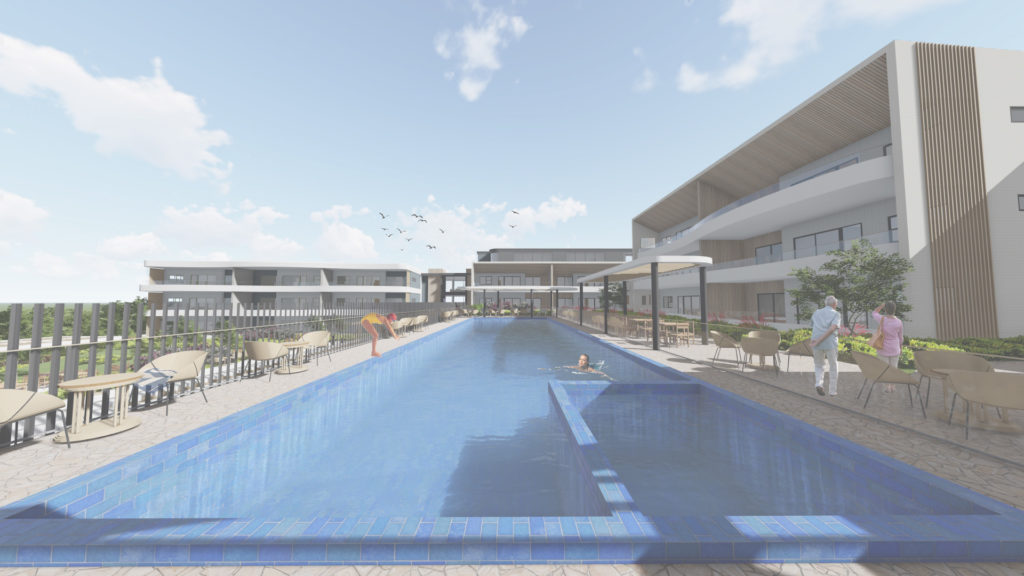 Taking inspiration from both Merimbula Main Beach and Lake, the undulating curves of the balconies create a movement to the built form that ripples as the sun hits from different directions during the day. The pool area and bowling club cascade down the site and create a multitude of great spaces in order to enjoy the expansive gardens, relax by the pool or utilise the sporting and social facilities throughout the village.